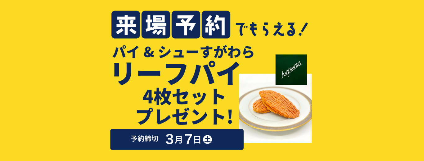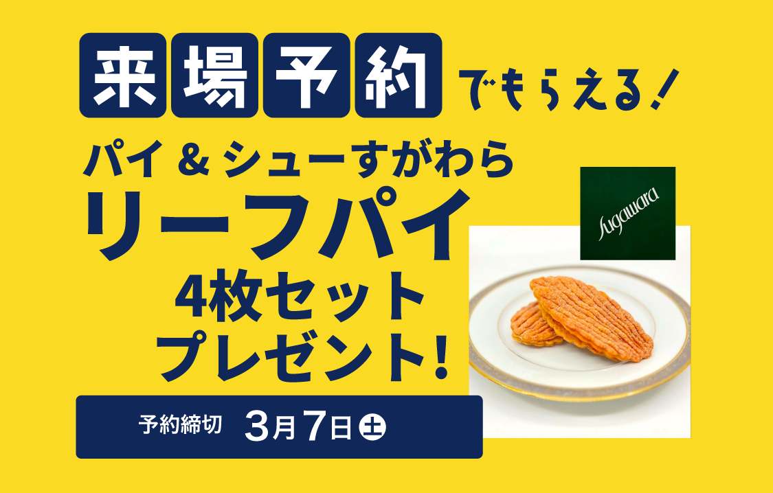 予約フォームからの事前予約が可能です。 【事前予約特典】 パイ&シューすがわら リーフパイ 4枚セットプレゼント! ※予約なしでの当日来場も大歓迎です! |